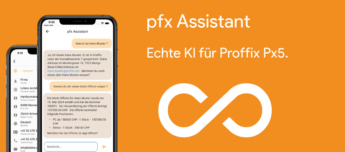 Stand heute ist pfx Assistant in der Lage komplexe Abfragen vorzunehmen. Er berücksichtigt dabei alle Benutzerberechtigungen und kann auch Aktionen («Öffne die Adresse») ausführen.